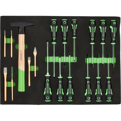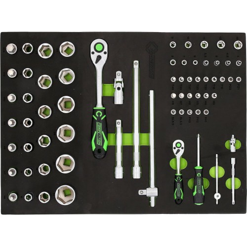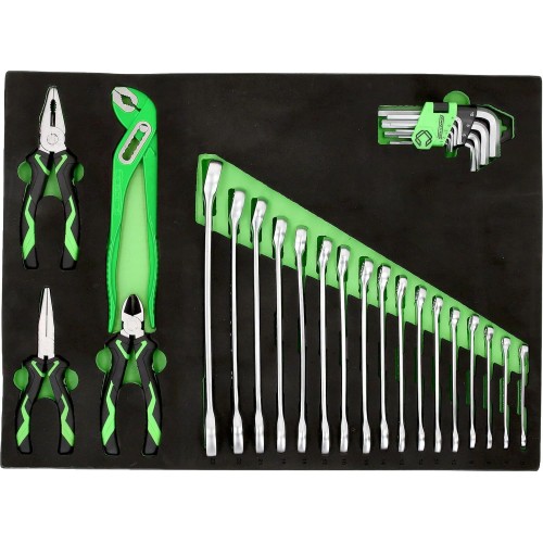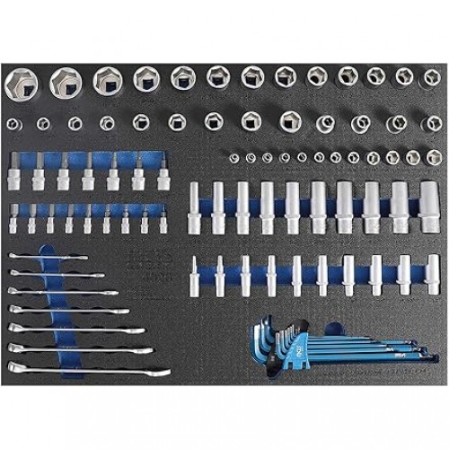 Den perfekta mekaniker verkstads vagnen med verktyg i både tum och milimeter , den enda i sitt slag med detta uppläget. Att ha i bil eller MC verkstaden när man mekar med olika fordon så finns det mesta i Tum och milimeter , inga onödig vertyg för att fylla upp vagnen med , och ingen " Kina" kvalite. Med hög kvalite på samtliga delar från Tyska Leverantörer som KS Tools och BGS Tools, tillverkade enligt DIN kvalite. Vagn från KS Tools med 7 kullagrade lådor på skenor som är låsbara med nyckel, samt stora bra hjul varav 2 är låsbara. Fem lådor är fyllda med diverse verktyg som ligger fint sorterat i skumplats, de blåa har tumverktyg och de gröna har milimeter verktyg.